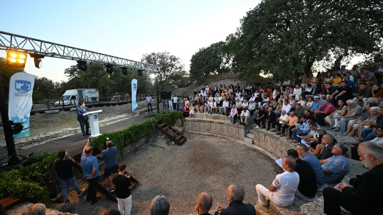 Başkan Erkek, “Bugün sıradan bir mekanda değiliz. Bugün sadece bir festivalde değiliz. Çok olağanüstü bir noktadayız. 5000 yıl önce bu bulunduğumuz noktada bir kent vardı. Burada mitlerin, şiirlerin, savaşların ve barış arayışlarının iç içe geçtiği Troya'dayız.