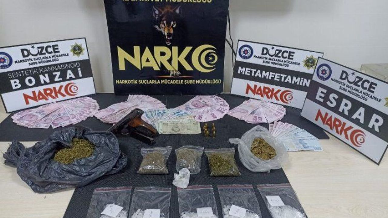 Durdurulan araçta 32 suç kaydı bulunan C.Y. ile 6 suç kaydı bulunan K.M.K.'nın üzerlerinde ve araçta yapılan aramada 58 gram metamfetamin, 36 gram esrar, 252 gram bonzai, tabanca ve tabancaya ait 7 adet 7.65 mm fişek ele geçirildi. Ayrıca suçtan elde edildiği değerlendirilen 51 bin 940 TL nakit paraya el konuldu.
