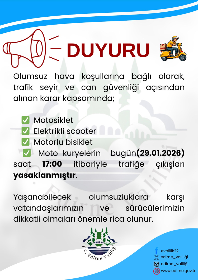Edirne Valiliği, kentte etkili olan olumsuz hava koşulları nedeniyle motosiklet, elektrikli scooter ve motokuryelerin trafiğe çıkışını ikinci bir duyuruya kadar yasakladı.