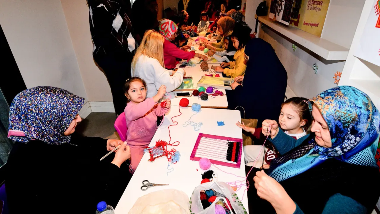 İzmir'de Bornova Belediyesi Çocuk Oyun ve Aktivite Merkezlerinde düzenlenen ebeveyn atölyeleri kapsamında, çocuklara yönelik dokuma atölyesi gerçekleştirildi. Minikler, ebeveynleriyle birlikte kilim dokuma çalışmaları yaparak hem el becerilerini geliştirdi hem de geleneksel dokuma sanatıyla tanıştı.