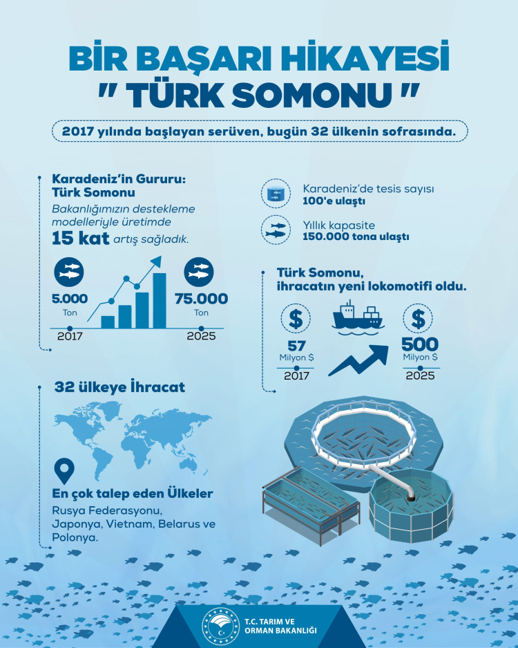 Tarım ve Orman Bakanlığı, Türk somonunun son yıllardaki hızlı yükselişine dikkat çekti. 2017'de 57 milyon dolar olan ihracat, 2025 itibarıyla 500 milyon dolara ulaştı.