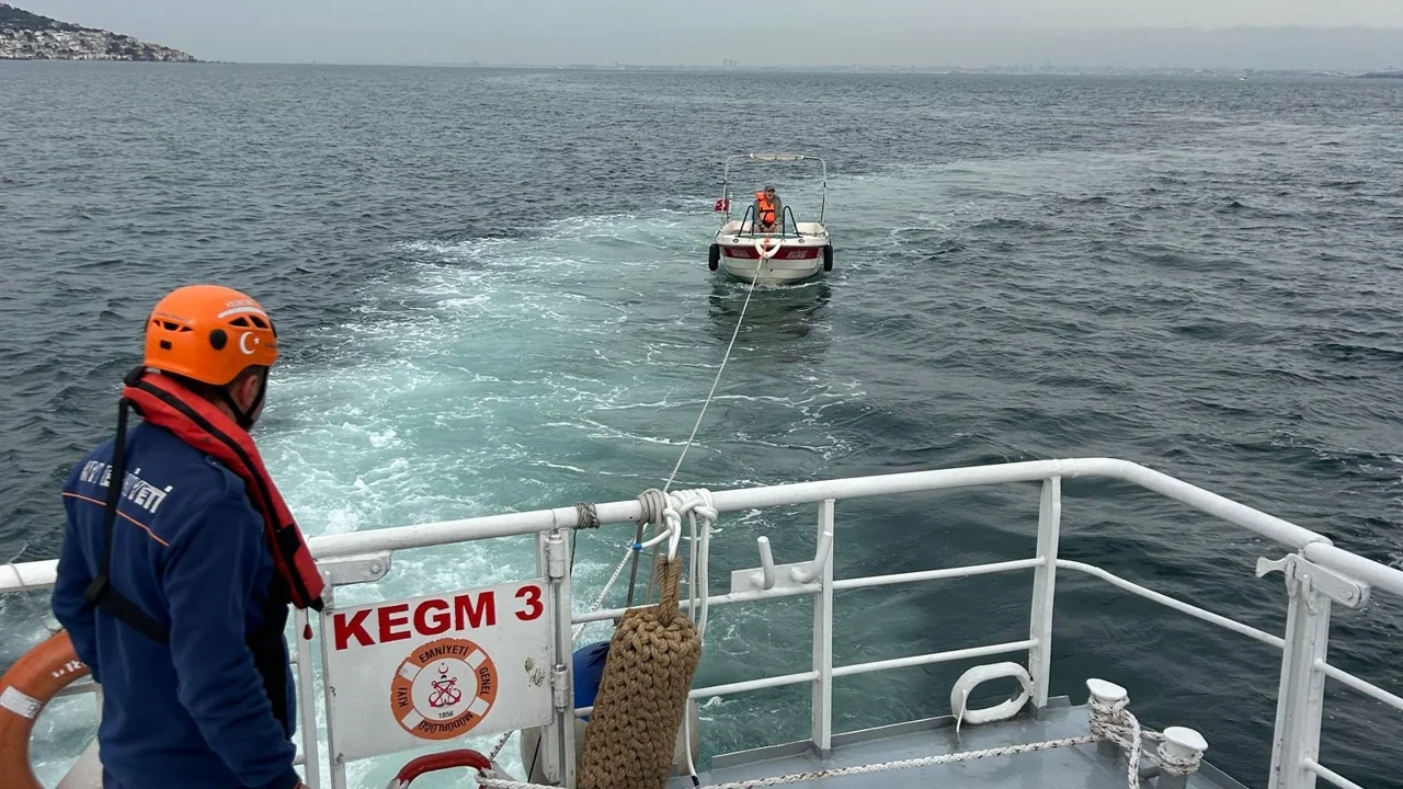 Bölgeye sevk edilen KEGM-3 hızlı tahlisiye botu, arızalı tekneyi yedekleyerek Küçükyalı Balıkçı Barınağı'na ulaştırdı.