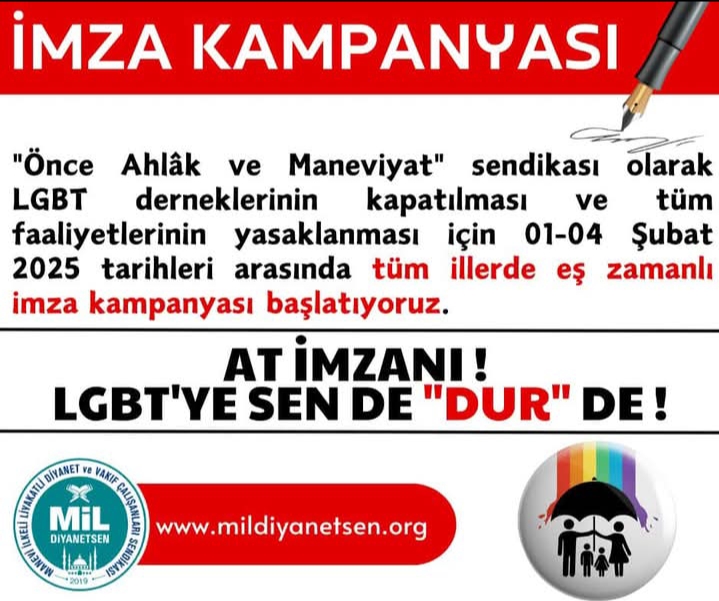 Mil-Diyanet Sen LGBT ile etkin mücadele çerçevesinde daha etkili olmak ve bu amaç ile kurulmuş dernek ve vakıfların kapatılması amacı ile Türkiye genelinde 01-04 Şubat 2025 tarihleri arasında imza kampanyası başlatacağını duyurdu.