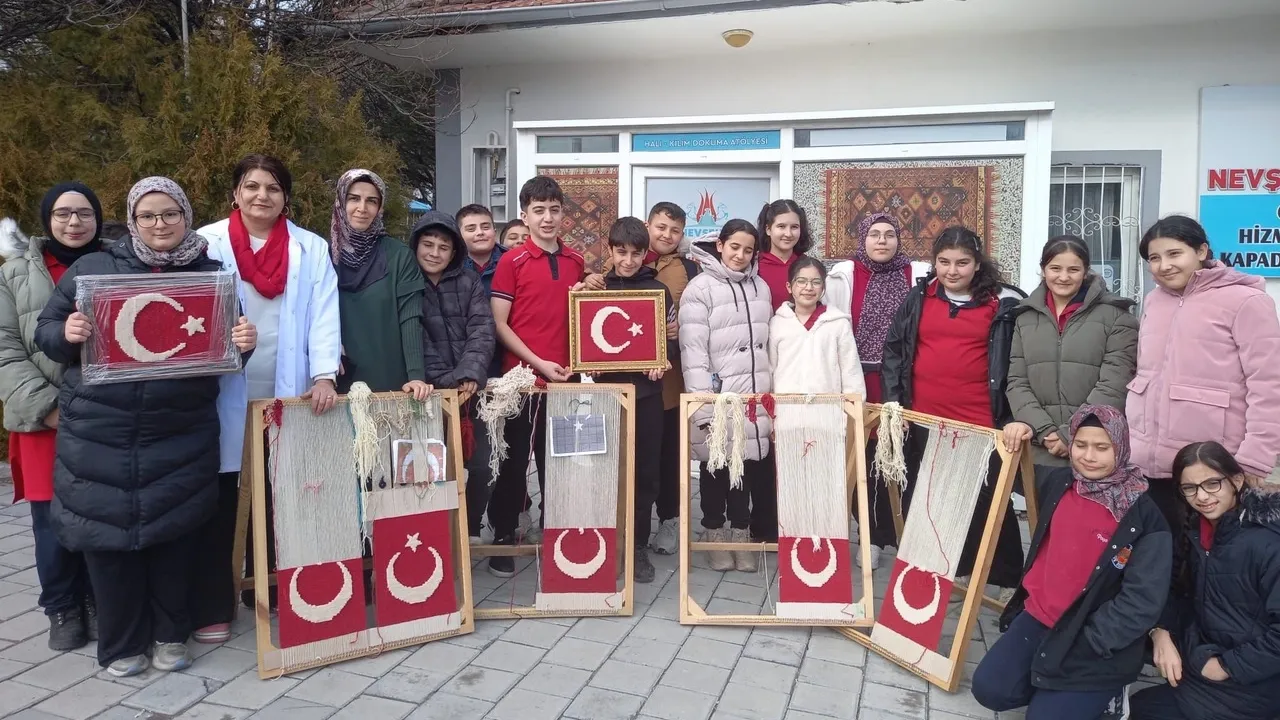 NEVŞEHİR (İGFA) - Nevşehir'de geleneksel el sanatlarını yaşatmak ve gelecek nesillere aktarmak amacıyla düzenlenen anlamlı bir etkinlikte, ortaokul öğrencileri tezgah başına geçerek Şanlı Türk Bayrağımıza ilk ilmeklerini attı.